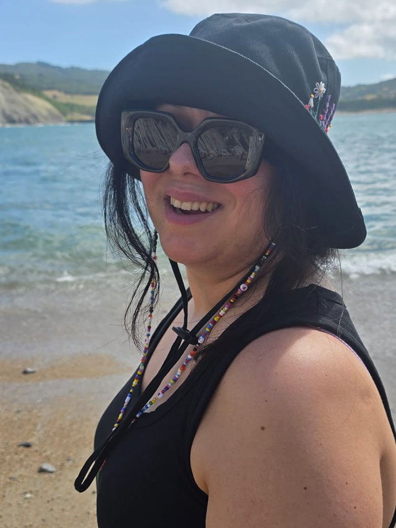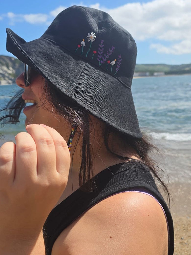 El gorrito que necesitas para la playa, piscina o para pasear y que no te de el sol en la cara. De color negro con unas flores monísimas bordadas a mano por mi, además tiene el ala super grande y un cordón que se ajusta por delante, para que no se vuele o poder llevarlo colgado en la espalda cuando no lo tienes puesto.