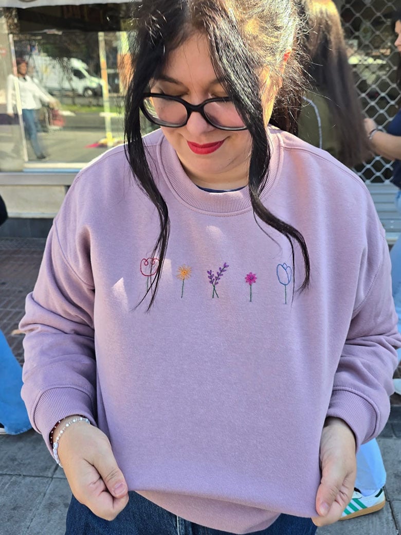 Sudadera morado claro con flores bordadas a mano. El interior es suave y tiene elástico en puños, bajo y cuello. Corte cuadrado oversize.